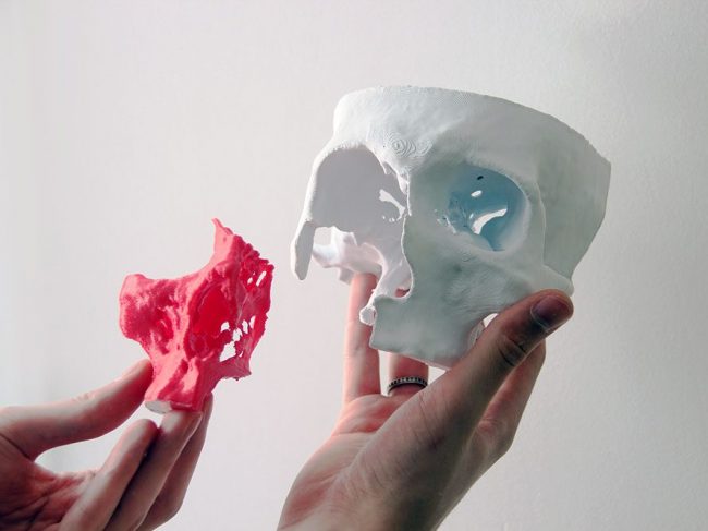 Protótipos impressos em 3D em material plástico, a partir de modelos 3D são obtidos através de tomografias para serem utilizados em análises e estudos pré-cirúrgicos.