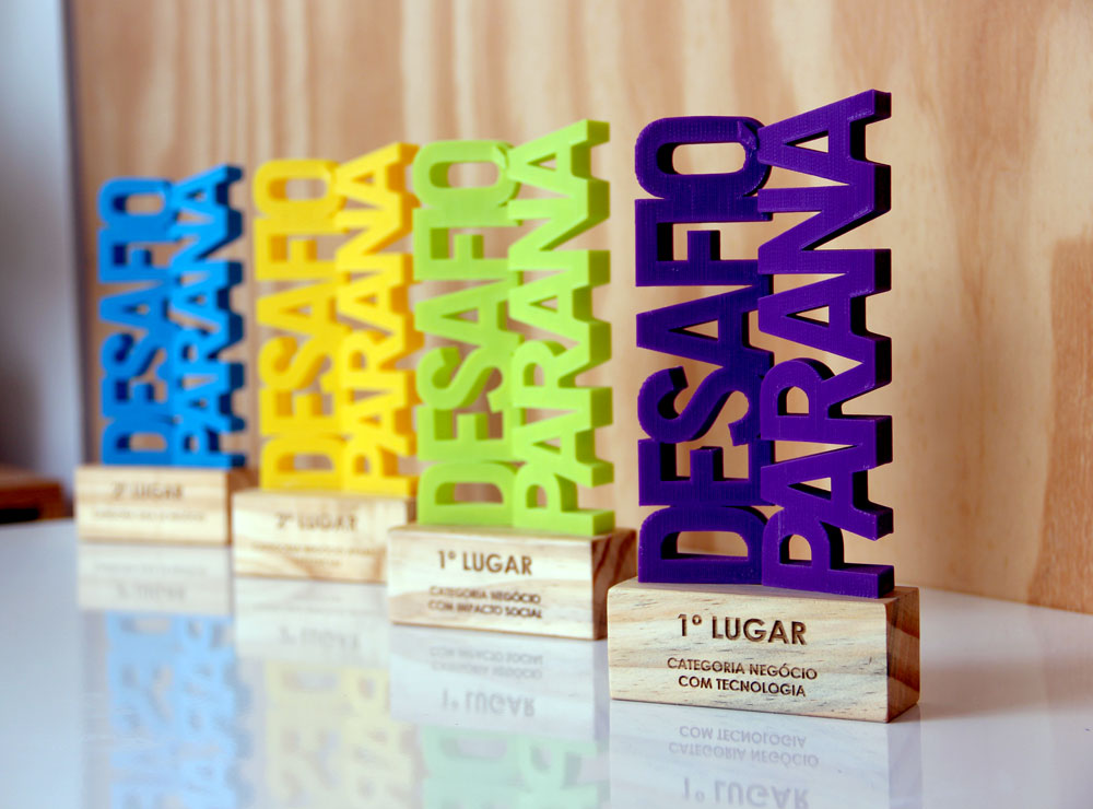 Para o Desafio Paraná, organizado pela Aliança Empreendedora, projetamos este troféu minimalista e versátil, utilizando o texto em destaque em impressão 3D, explorando uma volumetria dinâmica.