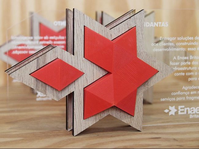 Utilizando a logo da empresa como elemento principal, este troféu foi desenvolvido para a Enaex Britanite, produtora de explosivos e na prestadora de serviços de fragmentação de rocha, para que pudesse entregar uma representação da essência da empresa para clientes e colaboradores.