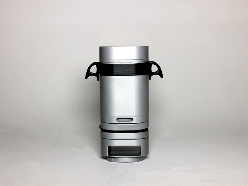 O produto foi fabricado em impressão 3D em material plástico e depois foi realizada uma pintura com acabamento metalizado.