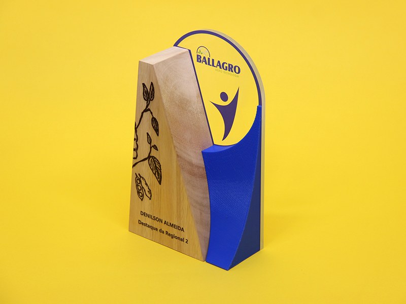 Este troféu é uma combinação de madeira maciça, acrílico e impressão 3D, criando uma peça verdadeiramente única. A base de madeira maciça proporciona um toque de elegância e durabilidade, enquanto a peça em acrílico adiciona um toque moderno e sofisticado.