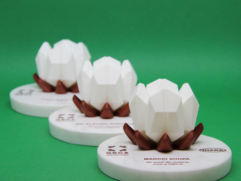 Desenvolvemos este troféu para a empresa japonesa de produtos agrícolas Ihara, para presentear os pesquisadores do Grupo Brasileiro dos Consultores de Algodão (GBCA), em comemoração aos 20 anos da instituição.