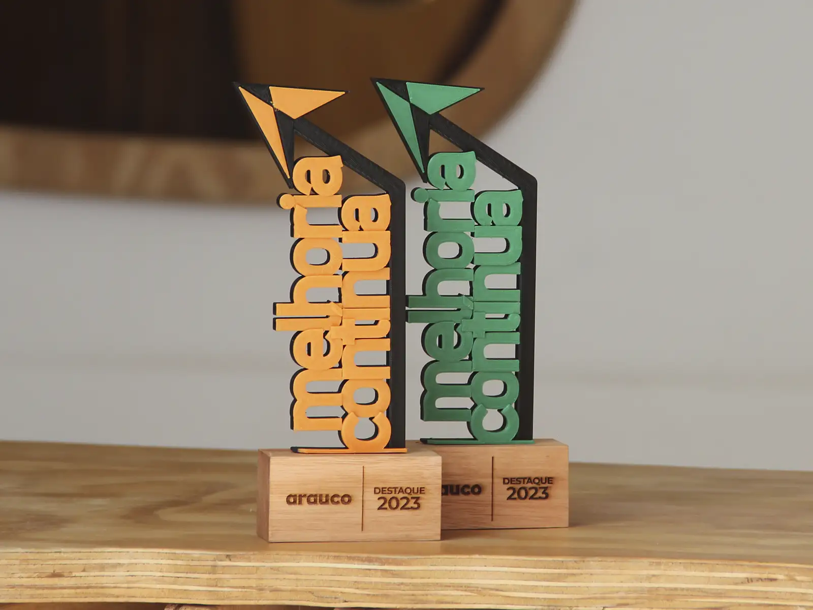 Desenvolvido exclusivamente para Arauco, uma empresa chilena líder no ramo madeireiro, especializada na fabricação de celulose e painéis e atuante no Chile, Argentina e Brasil. Este troféu personalizado simboliza o compromisso contínuo da empresa com a melhoria e a inovação em seus processos produtivos.