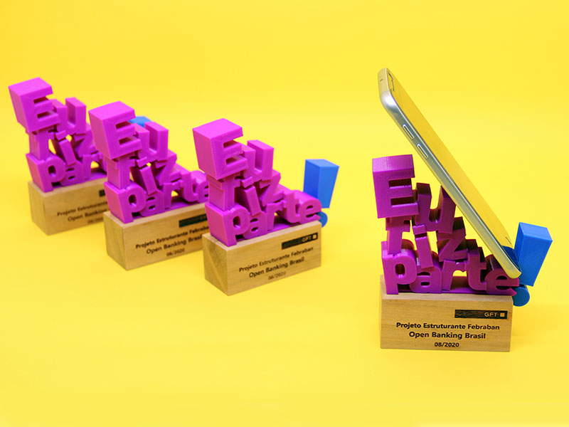 Este troféu foi projetado para a empresa de tecnologia GFT, para presentear colaboradores que participaram de um projeto da companhia. Além da premiação, o troféu também tem uma outra função: pode ser utilizado na mesa de trabalho como apoio para o celular.