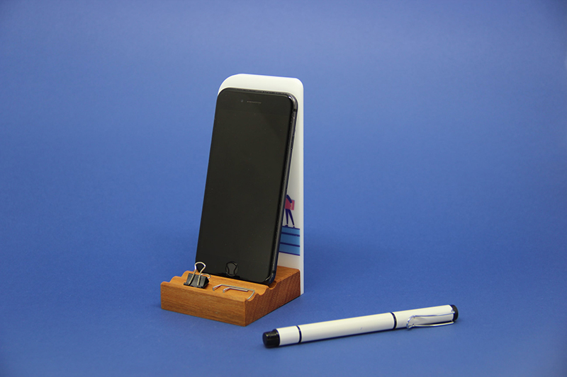 A peça pode ser utilizada como apoio para celular, com possibilidade de três ângulos. Além disso, outros objetos também podem ser apoiados, como clips, pen drives e outros utensílios.